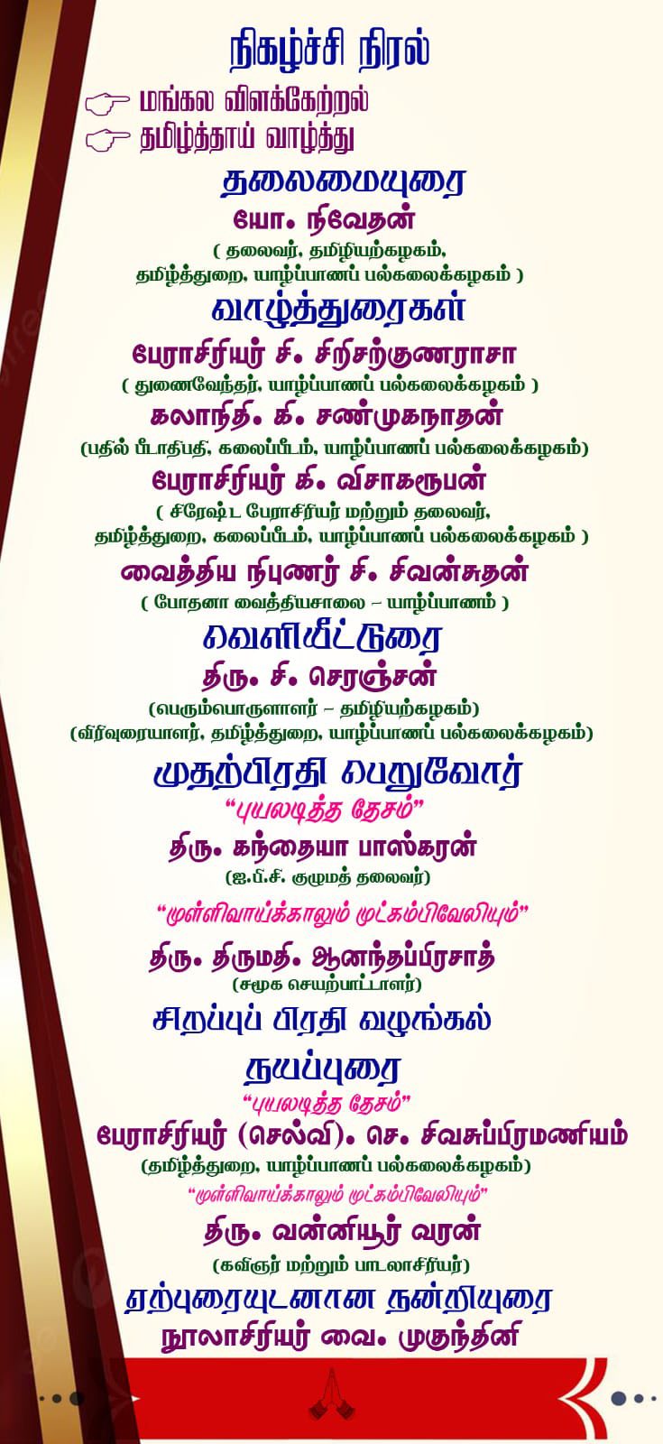 இந்நிகழ்வினை யாழ்ப்பாணப் பல்கலைக்கழகத் தமிழ்த்துறையின் தமிழ் சிறப்புக்கலை மாணவனும் தற்போதைய தமிழியற்கழகத்தின் தலைவருமான திரு. யோ. நிவேதன் அவர்கள் தலைமையேற்று நடத்தினார். இந்நிகழ்வில் பேராசிரியர்கள், விரிவுரையாளர்கள், மாணவர்கள், ஆர்வலர்கள் எனப் பலரும் கலந்துகொண்டு சிறப்பித்தனர்.