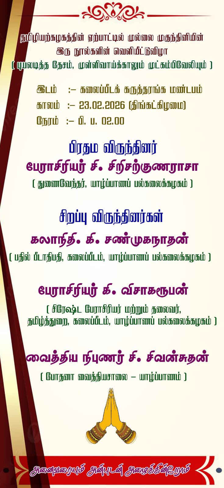 யாழ்ப்பாணப் பல்கலைக்கழகத் தமிழியற்கழகத்தின் ஏற்பாட்டில் 23.02.2026 அன்று, யாழ்ப்பாணப் பல்கலைக்கழகத் தமிழ்த்துறையின் 42ஆம் அணி தமிழ் சிறப்புக்கலை மாணவியும் தற்போதைய தற்காலிக உதவி விரிவுரையாளருமான முல்லை முகுந்தினி அவர்களின் ‘புயலடித்த தேசம்’ மற்றும் ‘முள்ளிவாய்க்காலும் முட்கம்பிவேலியும்’ ஆகிய இரு நூல்களின் வெளியீட்டு விழா மிகச்சிறப்பாக நடைபெற்றது.